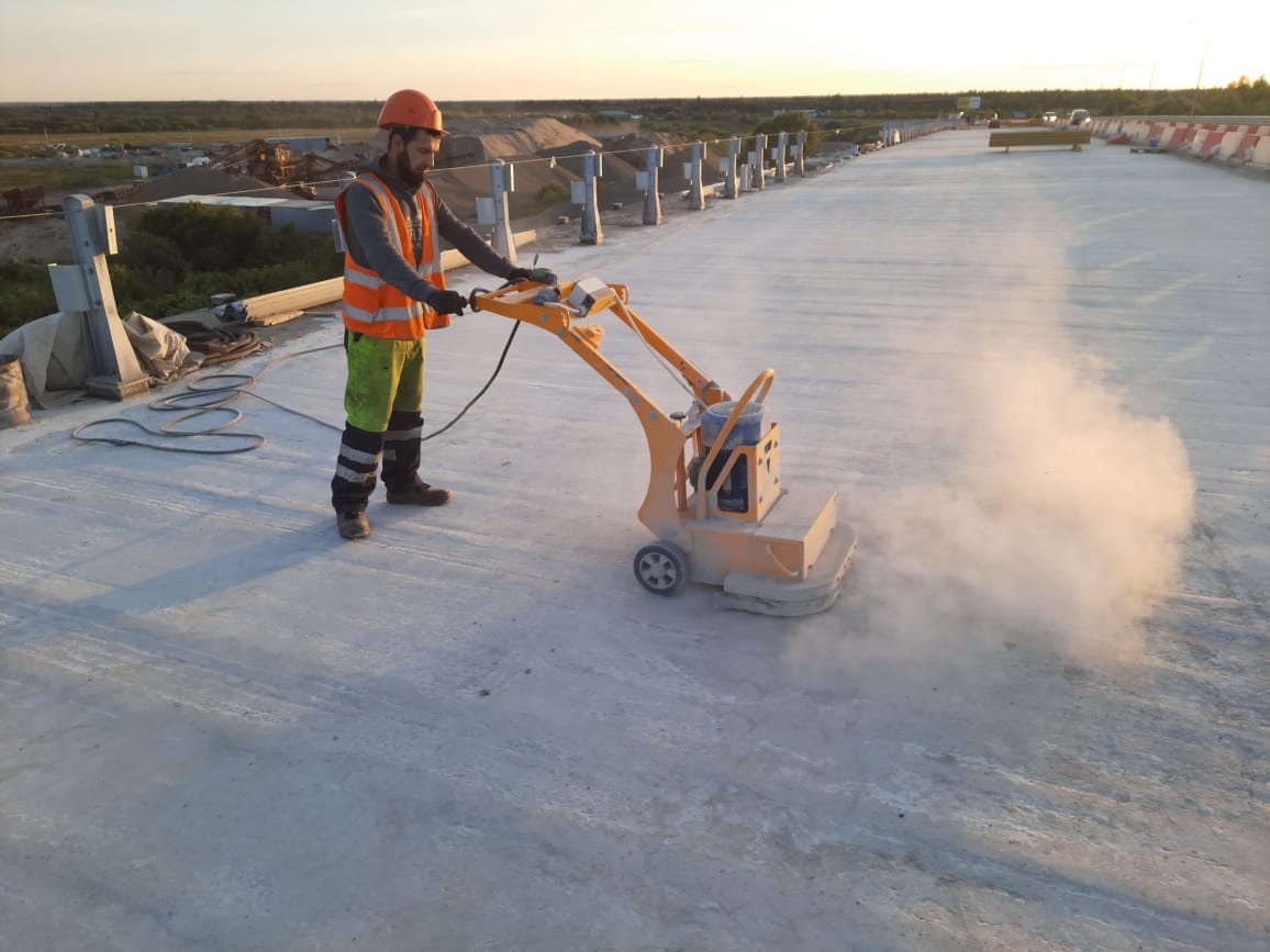 Подрядная организация выполняет работы на левой половине моста: монтирует деформационные швы, укладывает выравнивающий бетонный слой, шлифует готовую бетонную поверхность и наносит на нее гидроизоляцию. Под пролетами искусственного сооружения бригада выполняет покрасочные работы.